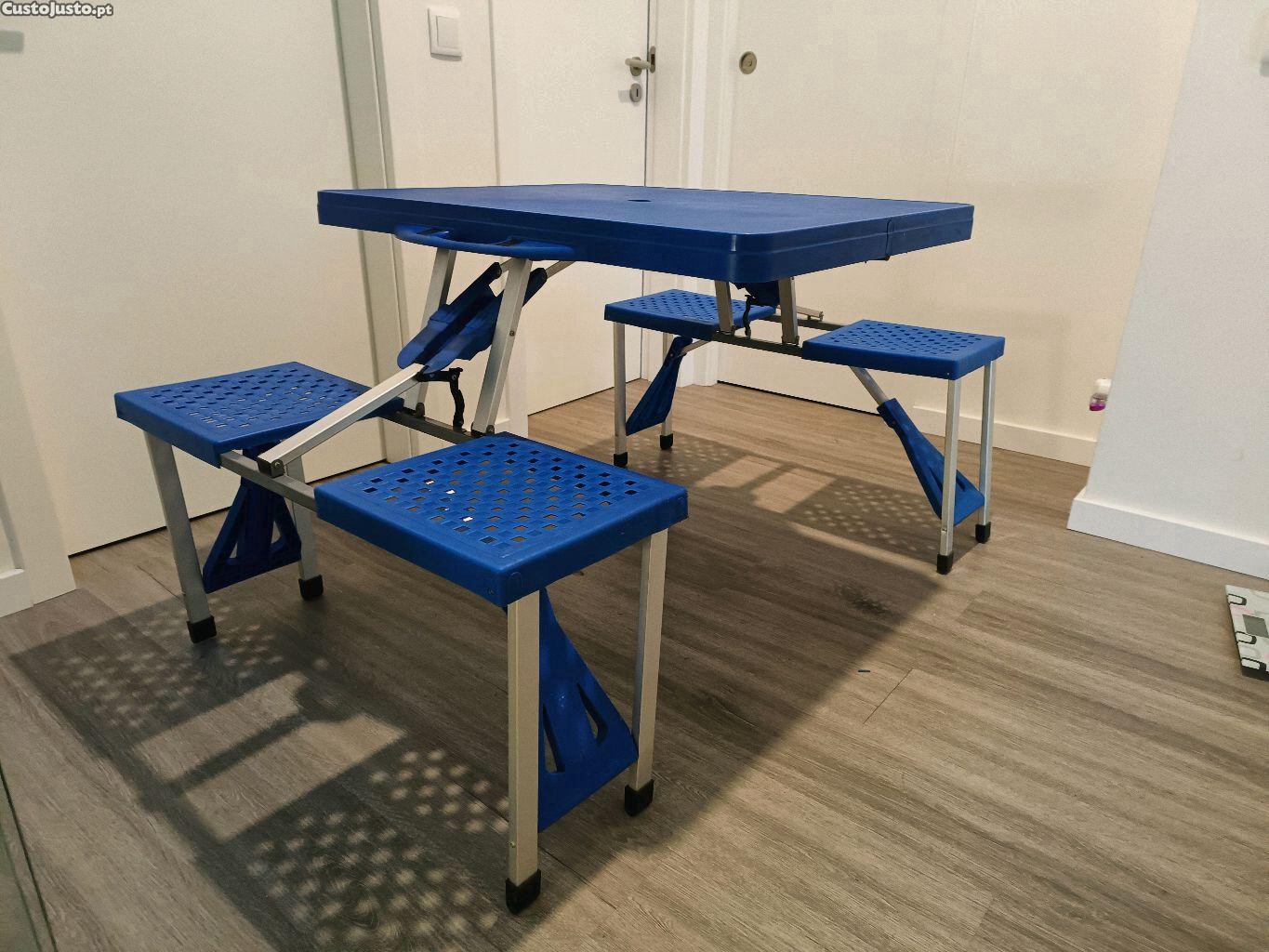 Mesa campismo 4 lugares, dobrável, fica uma mala de dimensão reduzida para facilitar o transporte, em bom estado