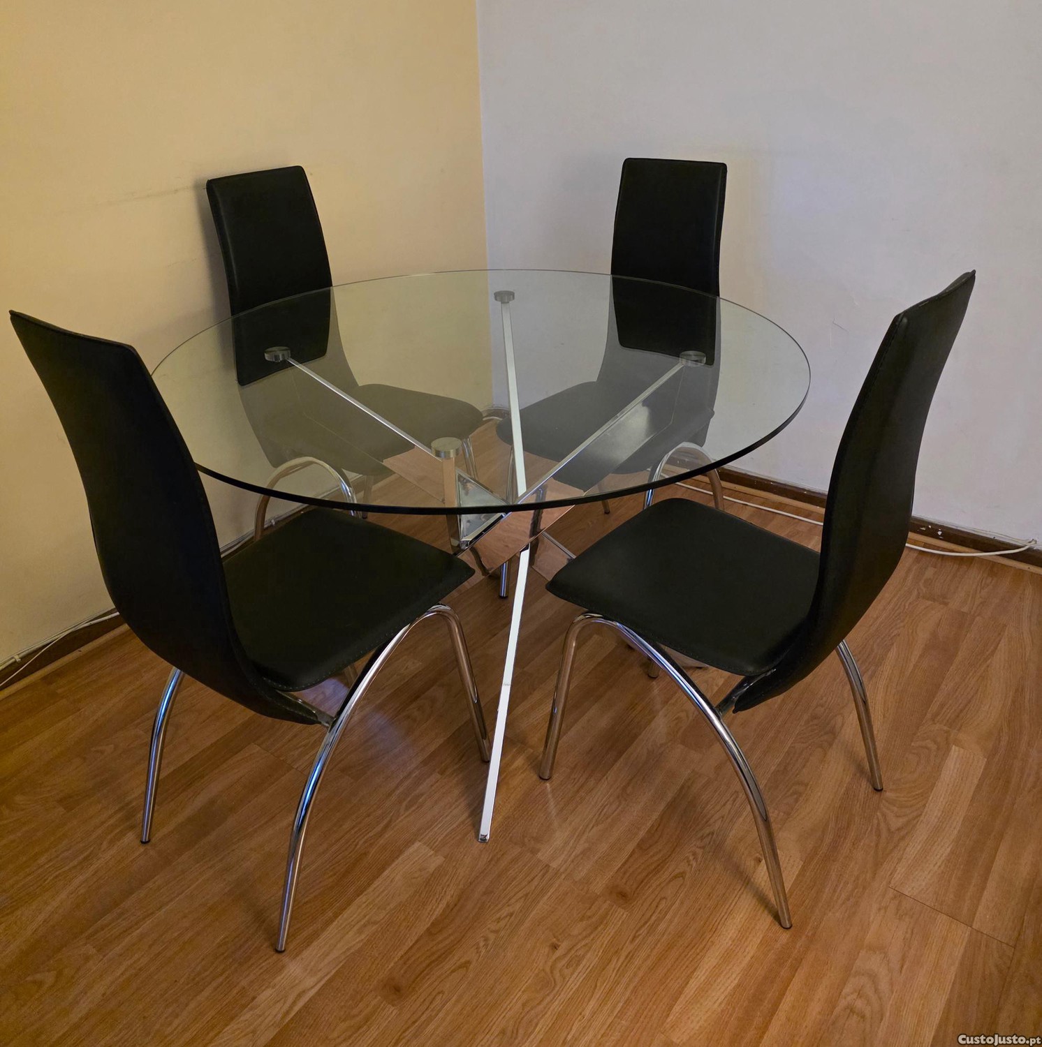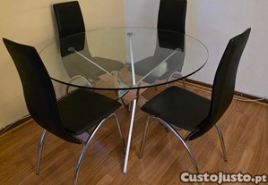 Vendo mesa de jantar redonda, de vidro, com 120 cm de diâmetro, mais as 4 cadeiras.