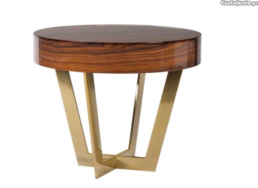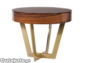 Mesa lateral com tampo em Pau Ferro e base em metal com acabamento dourado.