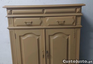Móvel de madeira antigo com dois armários e duas gavetas. Possui um design clássico. Apesar de usado, encontra-se em bom estado.