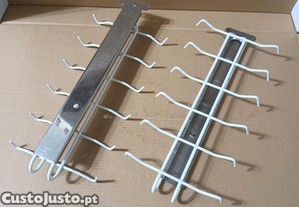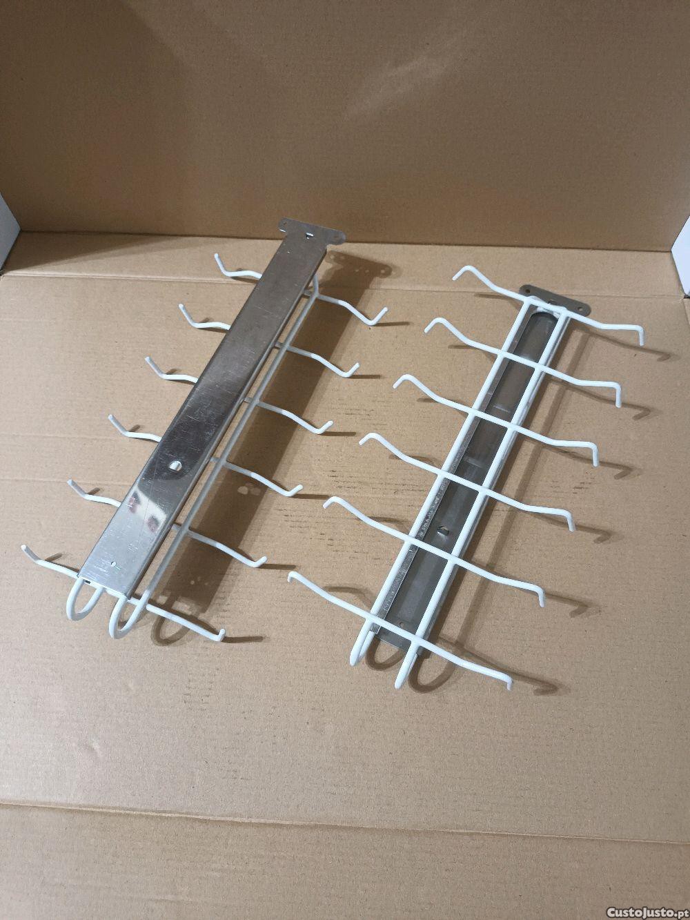 Par de suportes/cabides extratíveis com ganchos para pendurar chávenas ou canecas. Práticos e funcionais são ideais para organizar e armazenar as chávenas ou as canecas nos móveis da sua cozinha ou outros. Feitos em metal, com a base em aço inox e o conjunto de ganchos em aço lacado de branco resistente à água, cada um dá para 12 peças de loiça. Medem 30 cm de comprimento recolhidos e abertos medem 48 cm, tendo 12 cm de largura. Monta-se por meio de parafusos na parte de baixo das prateleiras. Não vendo em separado e o preço anunciado diz respeito ao par. Estão praticamente novos nunca foram usados. Barato para desocupar. Negociável, vendo pela melhor oferta. Possibilidade de vir buscar em mão.
