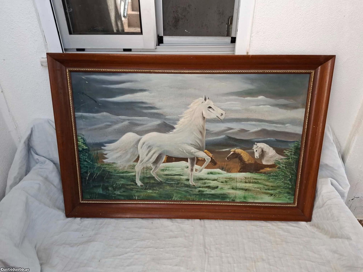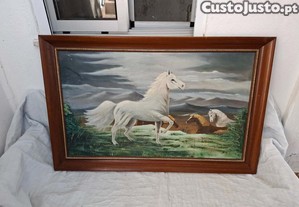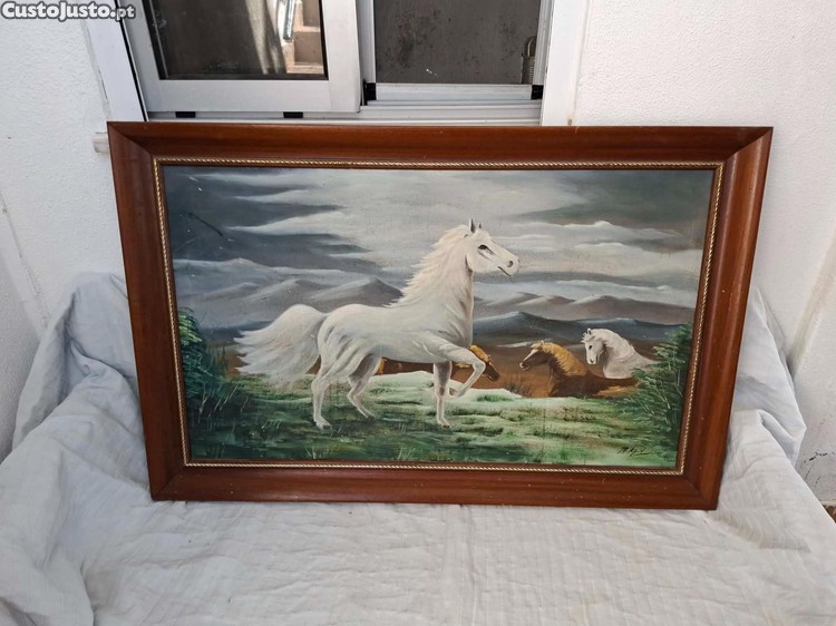 Quadro decorativo com motivo de cavalos em campo aberto. A pintura em óleo retrata dois cavalos brancos e um castanho em um cenário natural, com montanhas ao fundo. A moldura de madeira escura complementa a obra, conferindo-lhe um aspeto rústico e elegante. Sinais de uso.