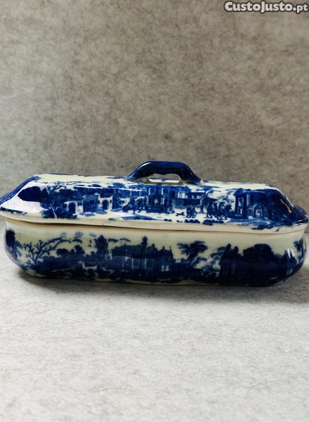 uma bela e colecionável caixa em faiança inglesa, estilo Flow Blue, da marca Victoria Ware Ironstone.