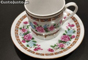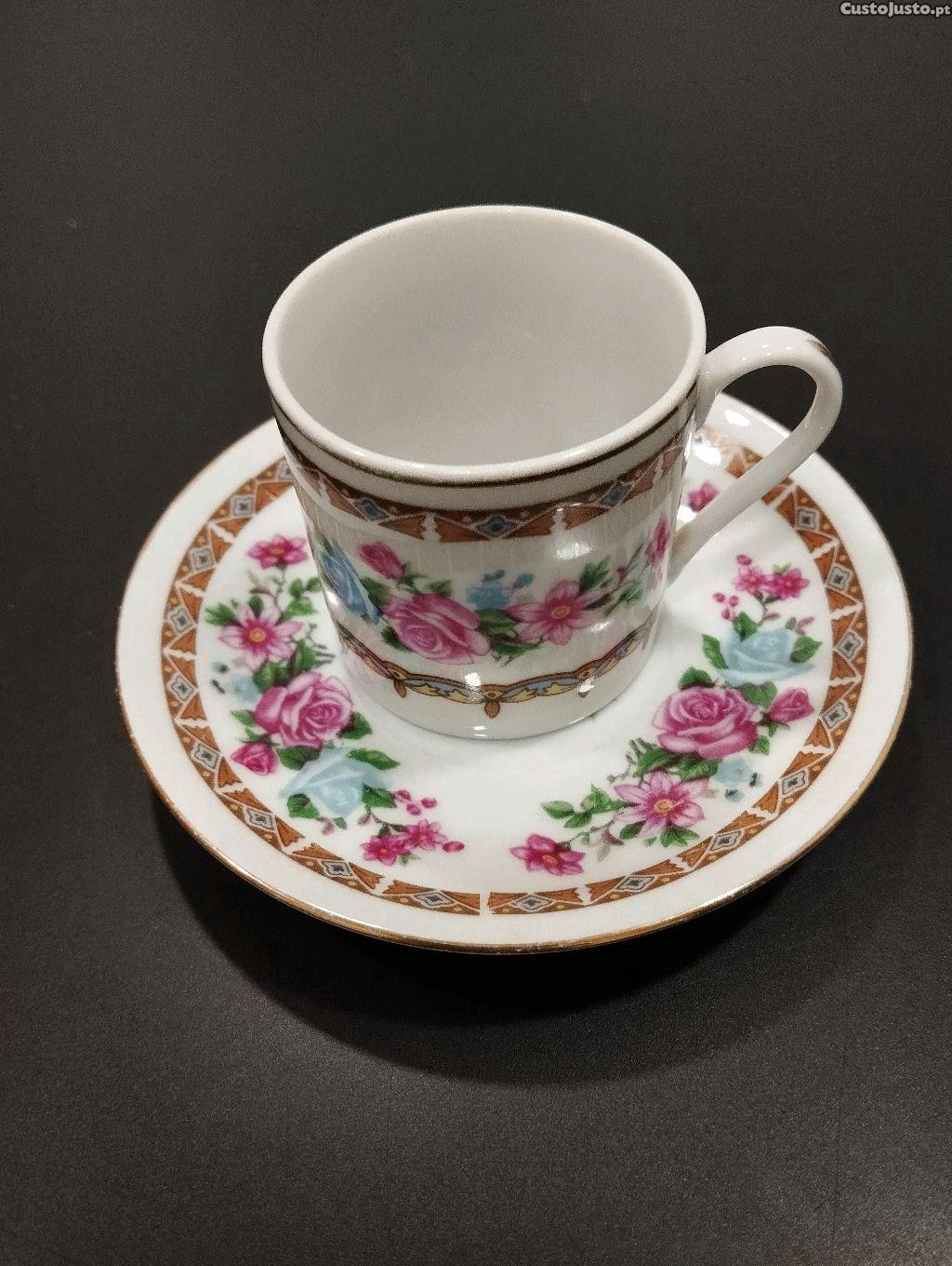 Conjunto de chávenas e pires de café com um belo padrão floral e detalhes dourados. Peça decorativa e funcional, ideal para servir café com elegância.