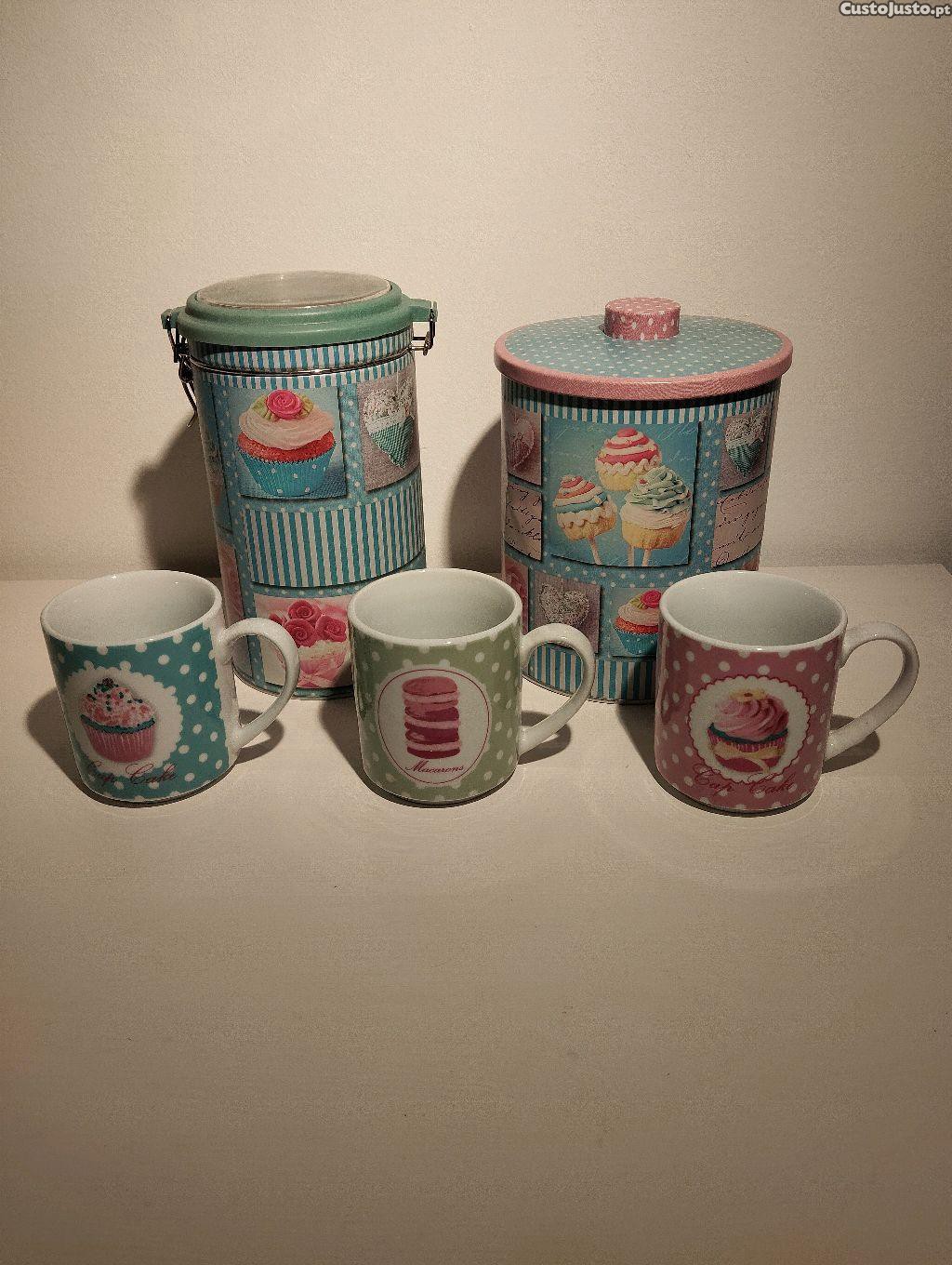 Conjunto de duas caixas de metal e três chávenas de porcelana decorativos com motivos de cupcaks. Ideal para guardar e servir os seus lanches favoritos. Feito de material resistente e com design atraente, este conjunto é uma ótima adição à sua cozinha.