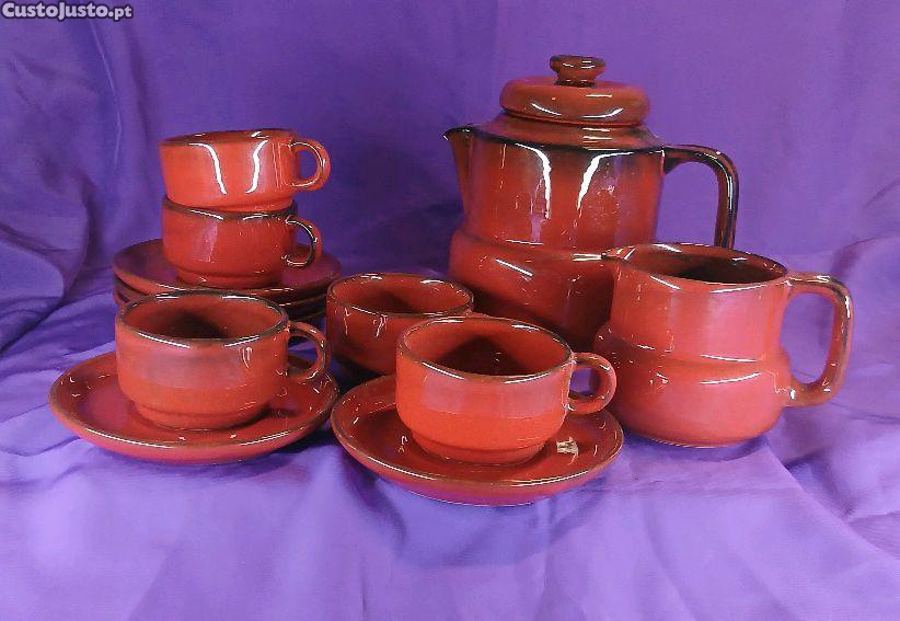 Composto por um bule, uma leiteira,cinco chávinas e respectivos pires.