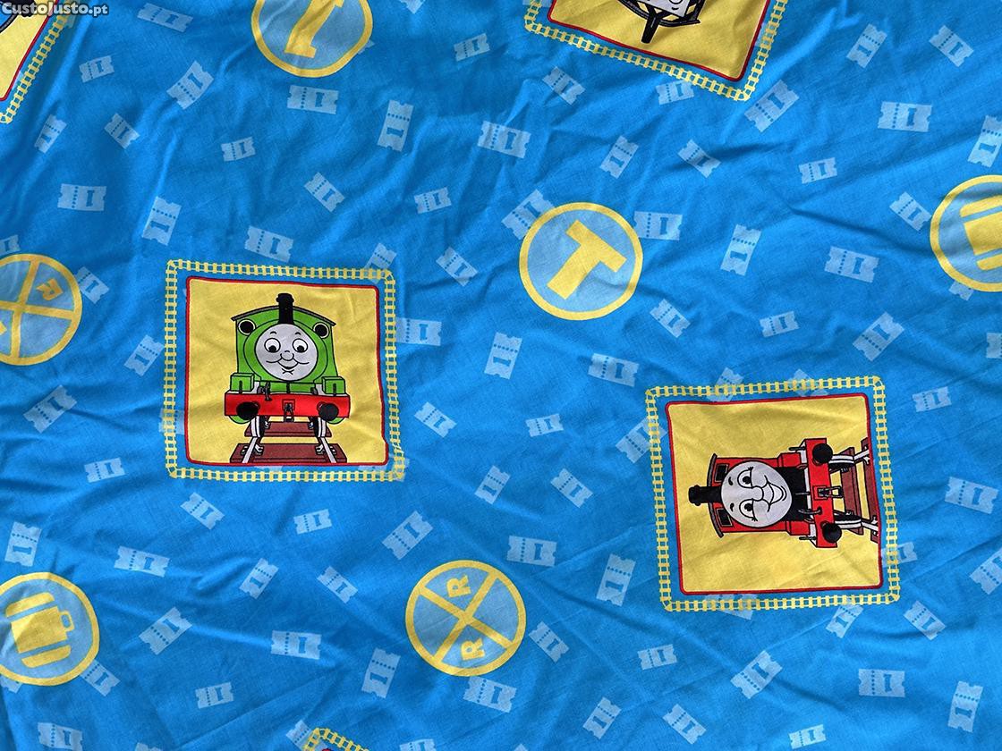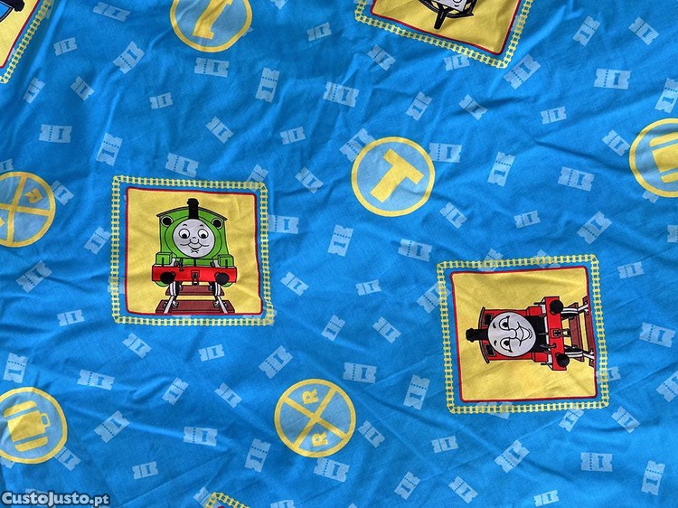 Este edredão tem dupla face, é reversível, com temas de ilustrações diferentes de ambos os lados e destina-se a uma cama de solteiro. De ótima qualidade, com toque suave e macio, mas consistente, este edredão Vintage reporta para os anos 80. Numa das faces, ao centro, salienta a icónica imagem das famosas animações Thomas & Friends , rodeada por pequenas molduras alusivas ao tema,. Note-se que não é apenas um capa de edredão, também possui o enchimento. As cores predominantes do edredão são o azul, o amarelo e o verde, salpicado por apontamentos de outras cores. O fator reversibilidade, confere grande versatilidade para que se adeque muito bem em qualquer ambiente e decoração, as crianças adoram e ajuda-as na hora de dormir, podendo até ser utilizado para ilustrar as próprias histórias na hora do conto. É um edredão de verão, especialmente adequados para dias mais amenos, mantendo a temperatura equilibrada. É extremamente raro, pelo que além da sua evidente utilidade é ainda um elemento de colecionismo.