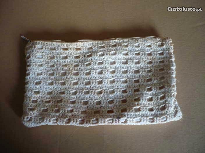 Estojo ou bolsa de cor branca feito artesanalmente com a arte do croché. O estojo mede cerca de 20 cm por 10 cm, tem forro e um fecho de correr. Está estimado com o fecho a funcionar. Barato para desocupar. Negociável, vendo pela melhor oferta.
