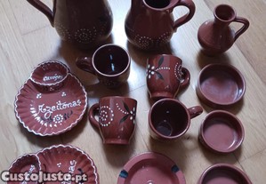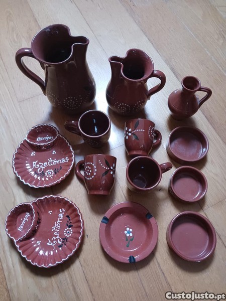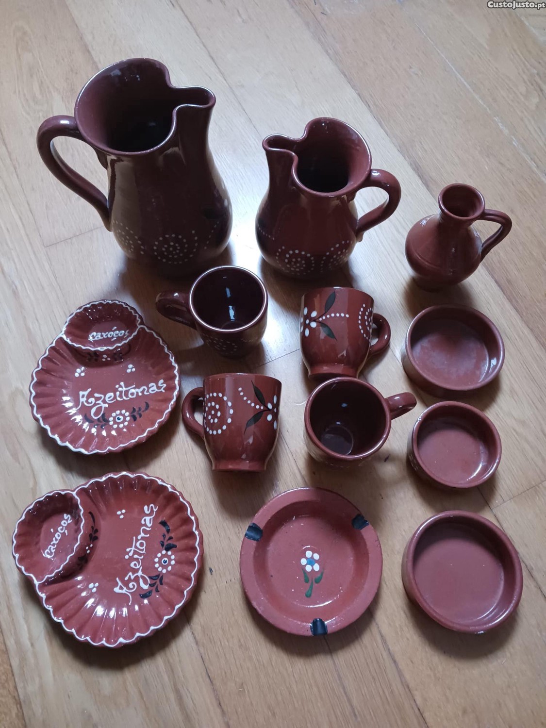 Conjunto de peças em cerâmica tradicional portuguesa, com acabamento vidrado e decoração pintada à mão em estilo rústico.