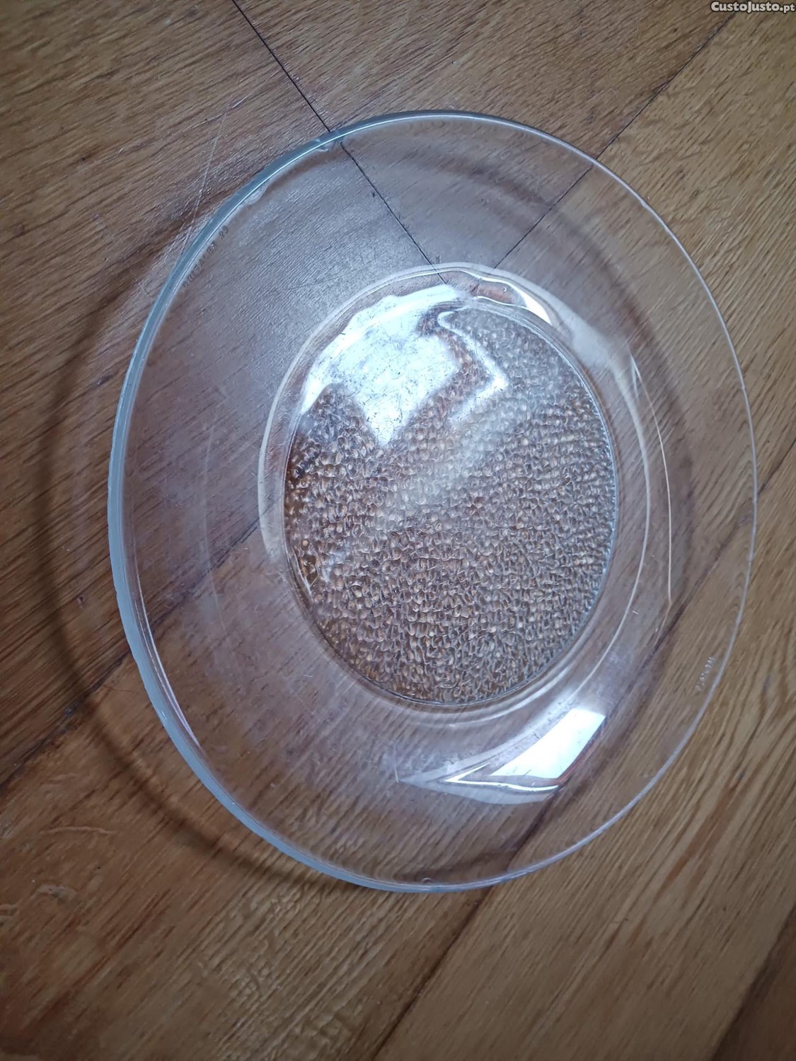 Pratos de vidro; refeição principal; transparente; redondo; simples.
