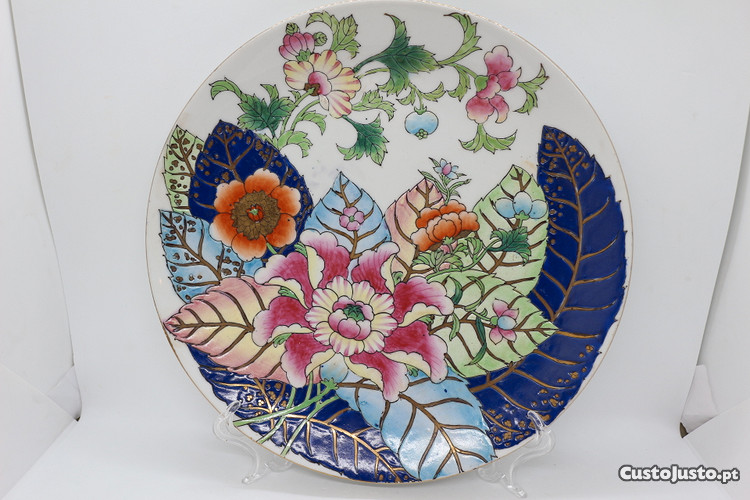 Prato grande com decoração de Folha de Tabaco , com pintura em relevo pintado há mão. Bordo a dourado