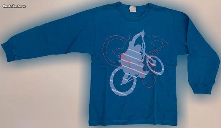 É de óptima qualidade, invulgar e original. De cor completamente azul forte, possui estampado, à frente, os contornos de um ciclista a vermelho e a sombra de um ciclista em acrobacias, em tom cinza. De corte direito, tem manga comprida e decote redondo, tanto o decote como as mangas terminam em malha elástica, para melhor ajustar-se ao corpo. É muito prática, moderna, irreverente e confortável, combinando muito bem com diferentes tipos de estilos, situações e ocasiões, sejam mais casuais, descontraídas, de lazer ou desportivas, dependendo das peças com que combina.