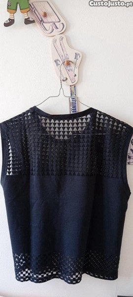 Blusa preta Zara, recortada com triângulos e quadrados toda à roda em cima e em baixo (recortes esses cobertos por tecido). Número 28.