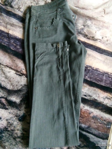 Calças da Berska, número 36. Cinzentas, justas, com fechos no fundo interior da perna. Bolsos atrás e à frente.