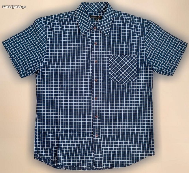 É de óptima qualidade, muito leve e fresca. De cor base azul escuro, possui em toda ela um xadrez com linhas finas, a branco. Tem um corte clássico e abotoa à frente com botões a azul muito escuro. Possui reforço ao nível dos ombros e tem manga curta. Tem ainda um bolso ao peito do lado esquerdo. A cintura é ligeiramente arredondada e possui ainda duas pinças nas costas, sob os ombros, para libertar os movimentos de forma elegante. Com um estilo muito prático e moderno, é muito confortável, requintada e elegante, combinando muito bem com múltiplos tipos de estilos, situações e ocasiões, sejam elas mais formais ou mais casuais, descontraídas, de lazer ou desportivas, dependendo das peças com que combina.