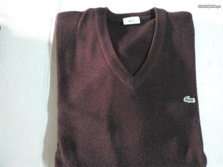 Camisolas Lacoste para homem com decote em V (uma camel e outra castanho). Tamanho 8. Acabamentos canelados na parte inferior da peça e nas extremidades das mangas. Crocodilo termosselado verde no peito. Lã (51%) e Acrílico (49%). Em muito bom estado. Cada 25EUR. Lote 2 camisolas 48EUR.