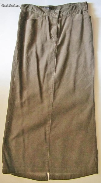 De grande qualidade, é da reconhecida marca Mango, ORIGINAL. De cor cinza médio, muito ligeiramente esverdeado, não possui qualquer tipo de estampado. Tem um corte clássico, com cintura média e presilhas, para permitir o uso de cinto. Fecha à frente com botões escondidos e um botão metálico visível. À frente possui dois bolsos e um atrás possui uma ligeira imitação de bolsos e ornamento em metal dourado escuro agregado à presilha traseira do lado direito, a imitar um cinto, com o símbolo da conceituada marca. É uma saia comprida, de corte recto e com uma grande racha atrás ao centro, para libertar os movimentos. É em bombazina de boa qualidade térmica e não possui forro. É muito prática, moderna e confortável, adequando-se com muita facilidade a diferentes estilos e ocasiões, sejam mais formais ou mais casuais e descontraídas, dependendo das peças com que combina.