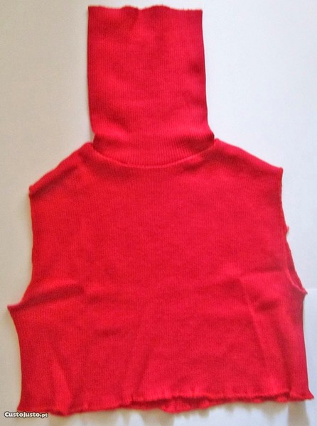 É em malha com boa qualidade térmica, moderno e irreverente. De cor completamente vermelho, não possui qualquer estampado. Tem recorte ao estilo colete, curto, termina um pouco abaixo do peito. De malha elástica, para melhor salientar a silhueta, possui gola bastante alta e permite usá-la em três formas diferentes. Pode ser utilizado simples ou em conjunto com outra peça, permitindo variar ainda mais as toilettes, conferindo-lhe muita versatilidade. É confortável e tem um vestir muito elegante e alegre e sofisticado, combinando muito bem com múltiplos tipos de estilos e ocasiões, sejam situações ou ocasiões mais formais ou mais casuais e descontraídas. Foi usado apenas uma vez, mas tem um pequeníssimo nó, imperceptível.