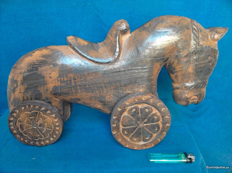 Cavalo com rodas em madeira talhada. Brinquedo intemporal que nunca avaria ou para os aficionados e colecionadores de arte equestre. Excelente tema de conversa. É pequeno demais para ser montado, mesmo por uma criança. Isqueiro (não incluído) apenas para comparação de escala. -- Qualquer informação via mensagem Custo Justo / e-mail ou contacto telefónico directo, não SMS. Para este artigo específico: apenas Lisboa (Cidade) e em mão.