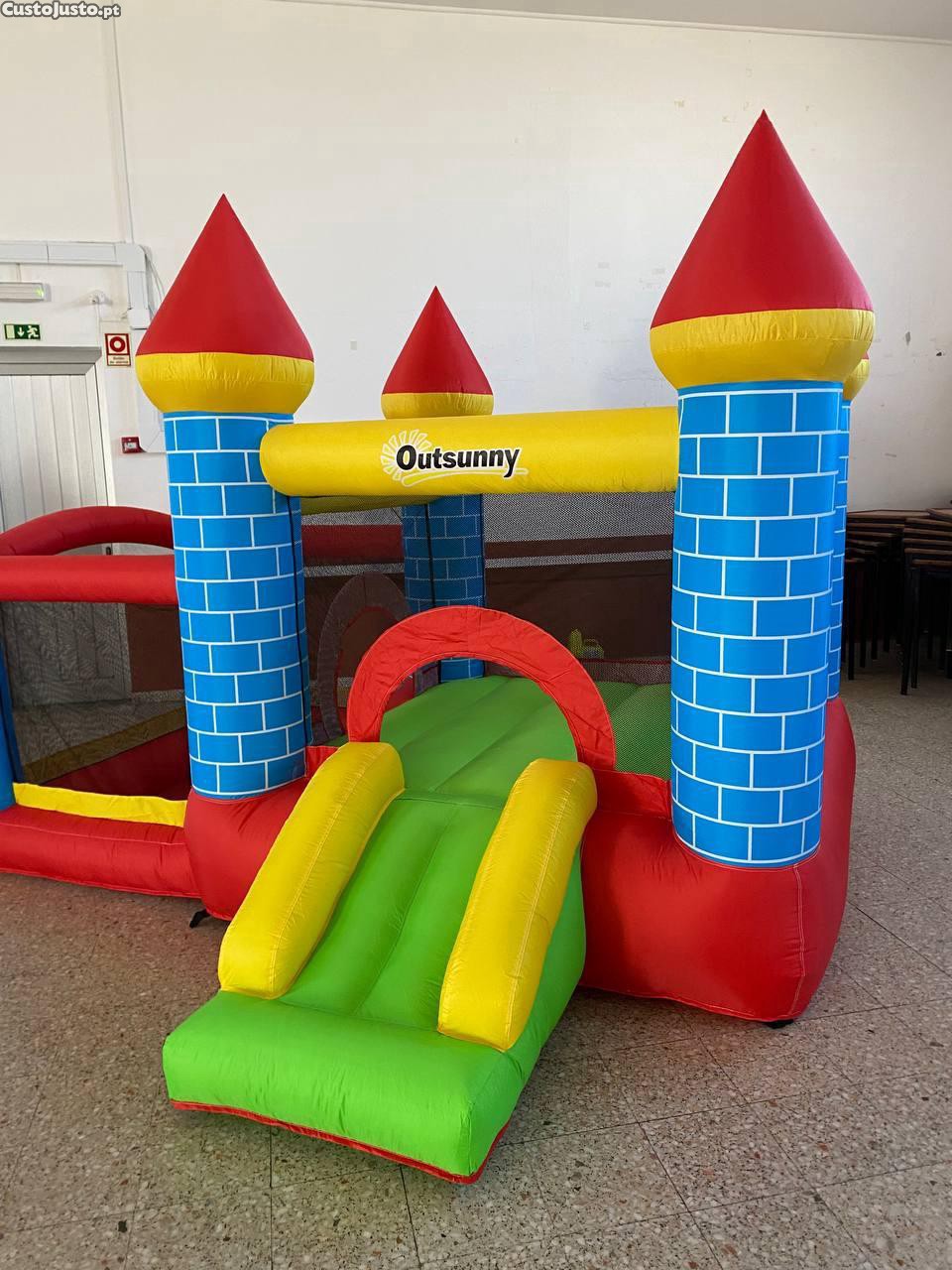 Este castelo insuflável combina várias atividades num único espaço, criando uma experiência divertida e dinâmica que rapidamente se torna o centro da festa.