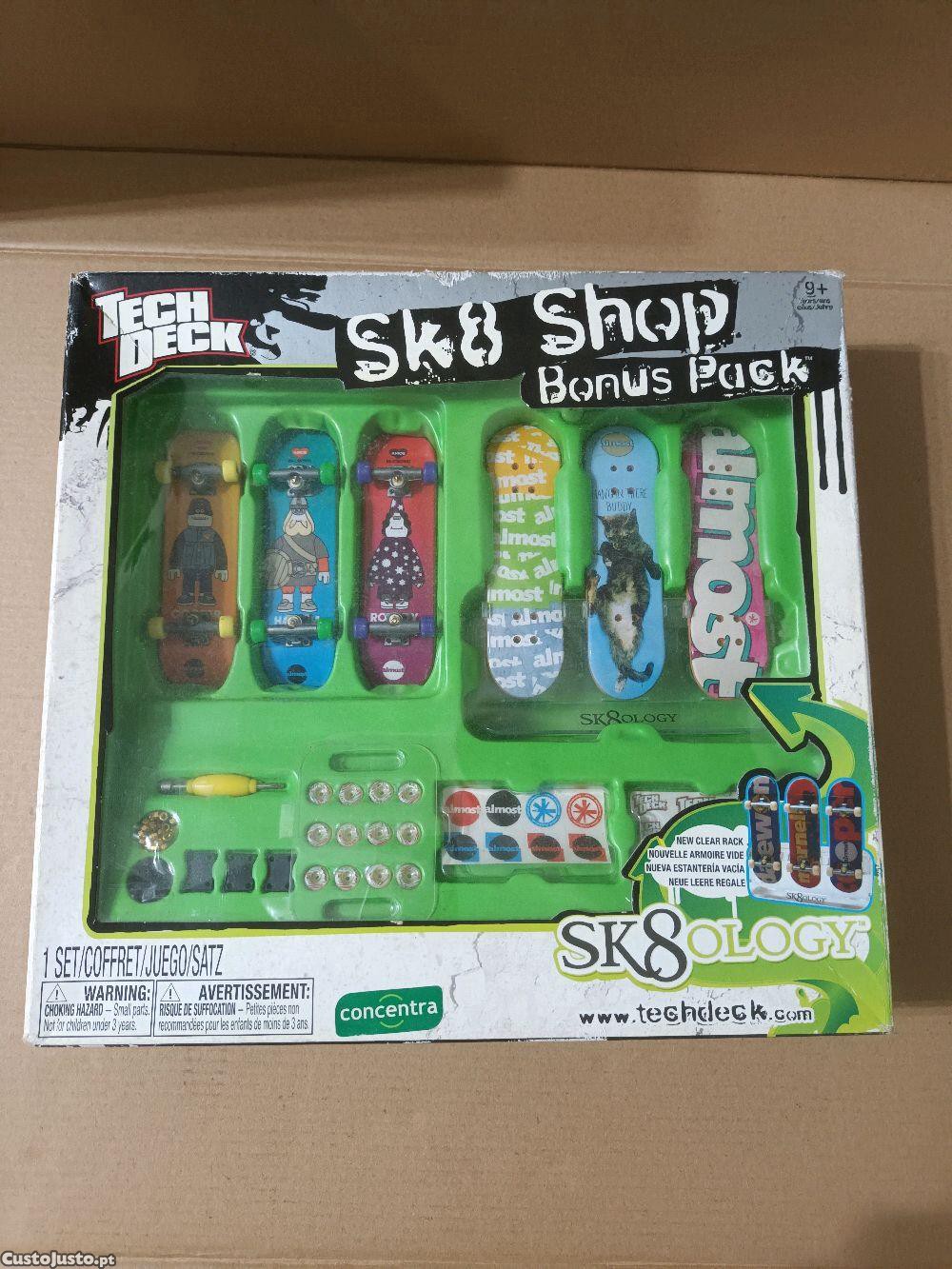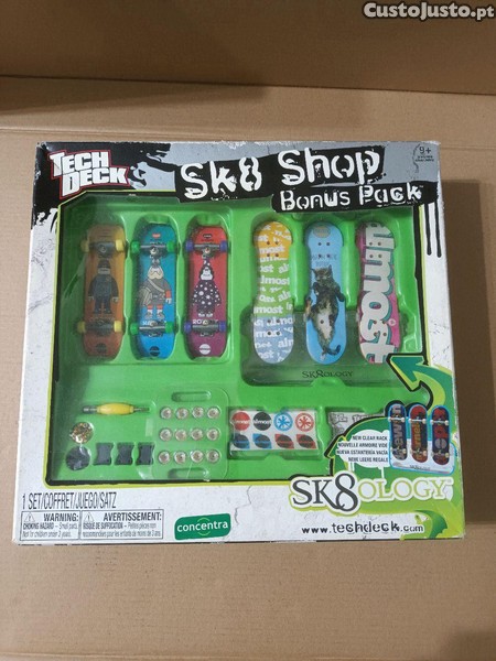Jogo com conjunto de miniaturas de skates e acessórios para se poder personalizar cada um deles. Este jogo permite que nele se faça a montagem e desmontagem dos skates em miniatura assim como a troca das diversas peças entre os mesmos. Trata-se de um jogo chamado Sk8ology Sk8 Shop Bónus Pack, da conhecida marca de brinquedos Concentra/ Spin Master, série Techdeck (techdeck.com). Os skates medem 8 cm de comprimento e destina-se a maiores de 9 anos. Está completo e nunca foi usado. Barato para desocupar. Negociável, vendo pela melhor oferta. Possibilidade de vir buscar em mão.
