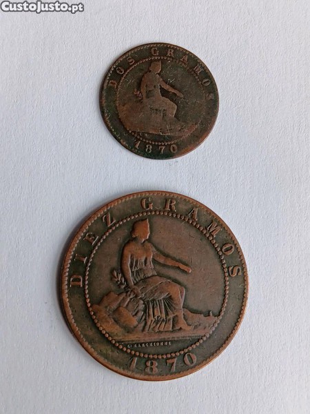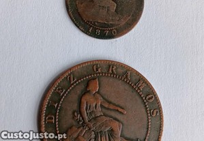 Tenho para venda 2 moedas de cobre de 2 e de 10 cêntimos de 1870 de Espanha. conforme fotos