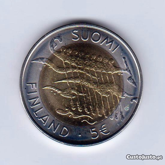 Moeda com o valor facial de 5 euros, cunhada em 2007 para comemorar os 90 anos de independência da Finlândia.