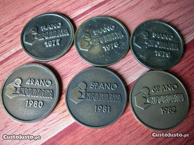 1779 - 6 Medalhas em bronze comemorativas dos 6 primeiros anos da Infordata. 1977; 1978; 1979;1980;1981;1982. Diâmetro 50 mm.