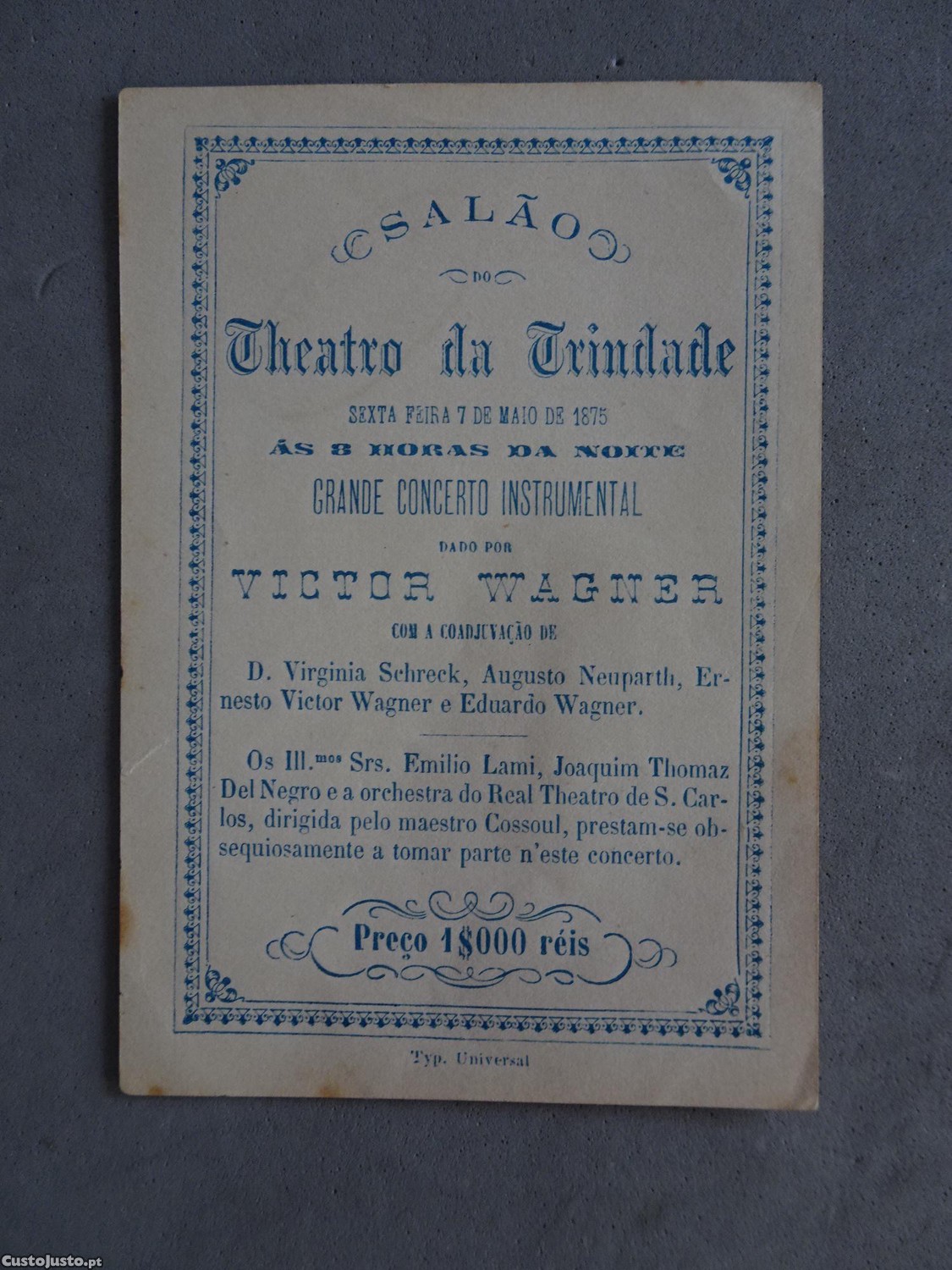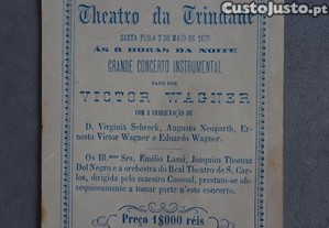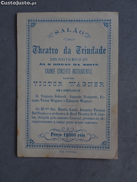 Preço: 14 €Antigo programa / cartão Teatro da Trindade Theatro da Trindade 1875 Às 8h da noite - Grande concerto Instrumental Lisboa