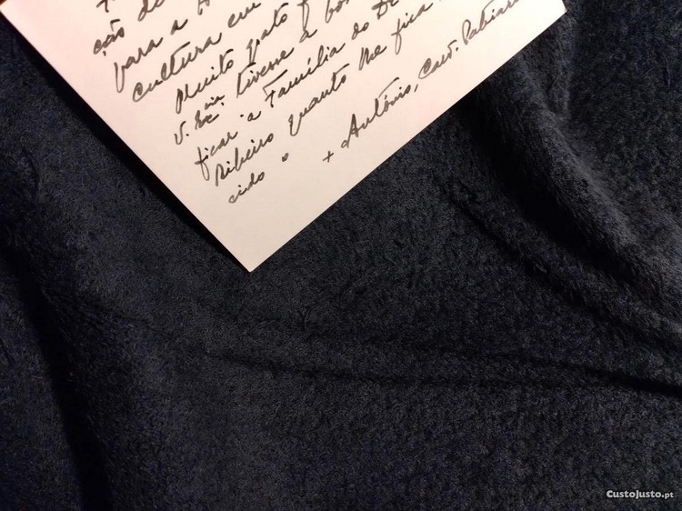 Cartão de agradecimento manuscrito pelo Cardeal Patriarca de Lisboa, D. António Ribeiro. Escrito de ambos os lados e assinado, com agradecimento a Luís de Pina pelo envio de um livro de M. Félix Ribeiro. Óptimo estado, com a marca de um clip onde junta anúncio de imprensa sobre o livro em questão.