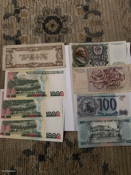 Conjunto de 8 notas de diversos países estrangeiros: Filipinas (aquando a sua ocupação pelo Japão), Jugoslávia, Rússia, União Soviética, Guiné-Bissau e Peru. Notas em diferentes estados de conservação.