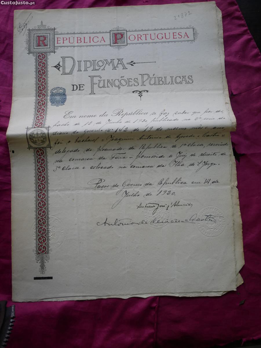 N 21871 Diploma assinado por António José dAlmeida, de promoção do delegado do Procurador da República de 1 classe na comarca da Feira a Juiz de Direito de 3 classe colocado na Ilha de S. Jorge a 14 de Julho de 1920. 4 Fólios. 32,5x28,5cm.