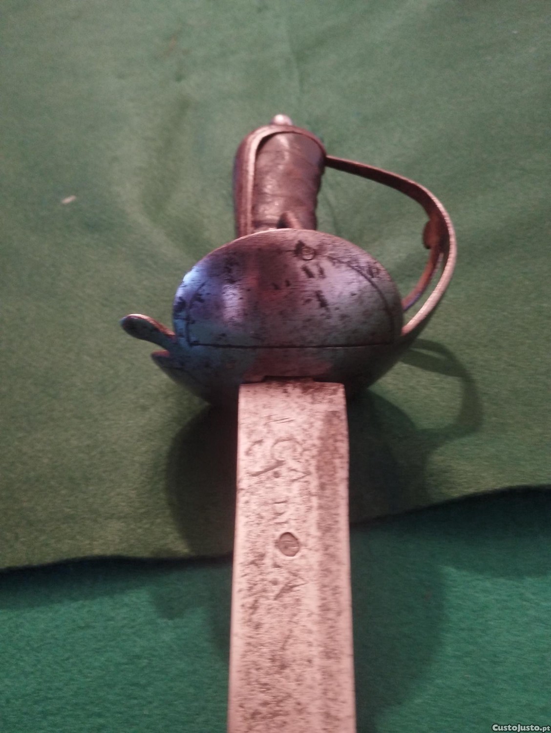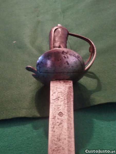 Lâmina plana de um só gume com a inscrição "Cavalerie de Ligne 1805 Tº" de um lado e "C IV" de outro, além de "CHARLES IV". Lâmina com leve oxidação, já limpa. Guarda de aço com três braços. Cabo de madeira revestido em couro. Completa e original, com oxidação na parte interna da guarda. Usada na Guerra Peninsular.