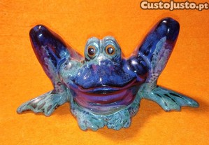 Estátua de cerâmica em forma de sapo com detalhes coloridos e expressão engraçada. Uma peça decorativa única e divertida para adornar a sua casa. Predominantemente azul cobalto e verde água com detalhes em castanho nos olhos . Peça em muito bom estado . Inclui portes em correio normal . Medidas L. 17 X A. 8 X C. 9 cm .