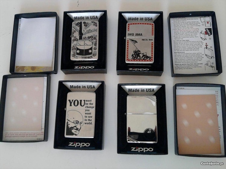 4 Isqueiros Zippo novos , com caixa documentos originais, cada 29 EUR . Gandhi vendido.