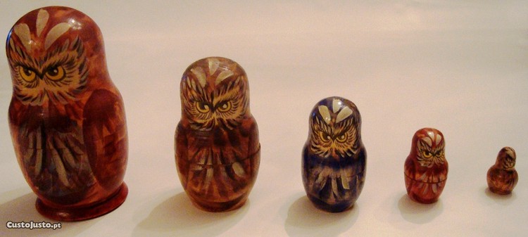 Boneca tradicional Russa, constituída por uma série de bonecas ocas, feitas geralmente de madeira, que são colocadas umas dentro das outras, da maior (exterior) até a menor a única que não é oca