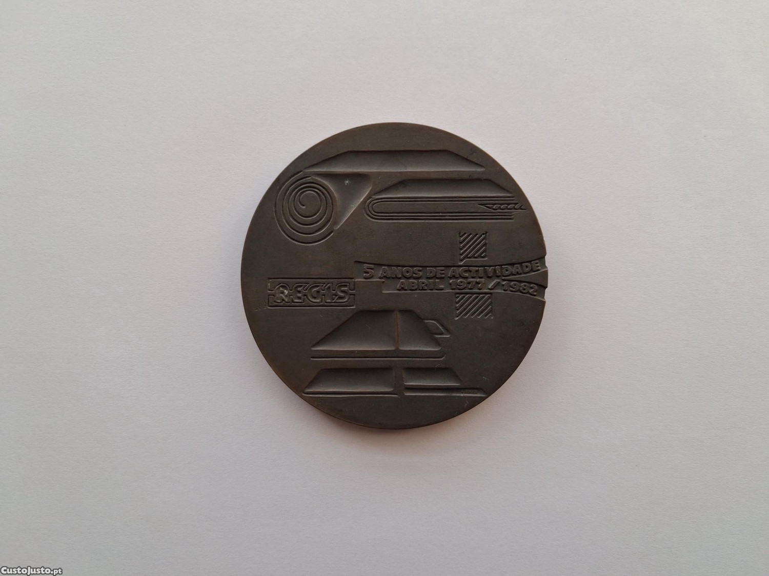 Vendo uma medalha em bronze comemorativa do 5º Aniversário da Regis - 1977-1982, com um diâmetro de 8 cm, espessura de 5 mm e peso de 206 gr.