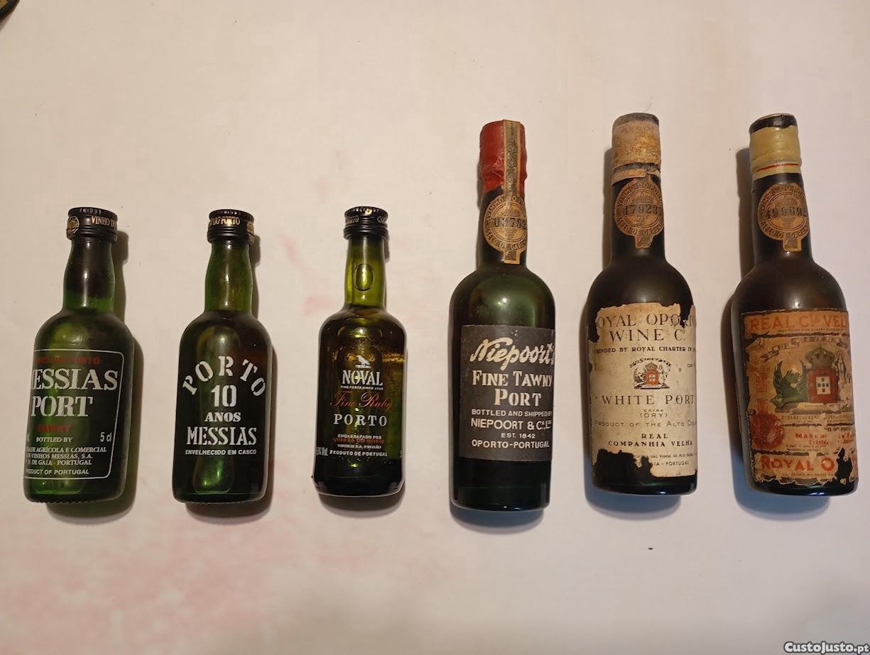 7 garrafinhas miniatura de vinho do Porto (3 Messias; 2 Real Companhia Velha; 1 Noval e 1 Nieport's)
