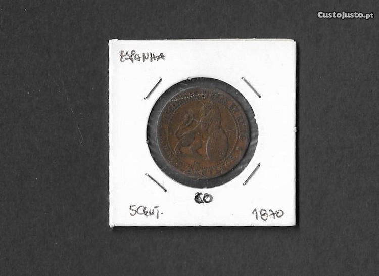 Moeda de 5 centimos. Espanha 1870 (governo provisório 1869/74), cobre, diam.25mm e espessura 1,2mm. A moda representada será a enviada.