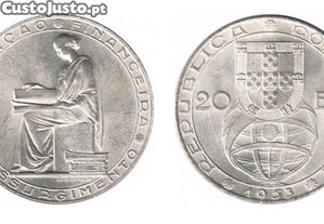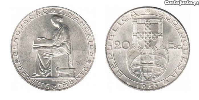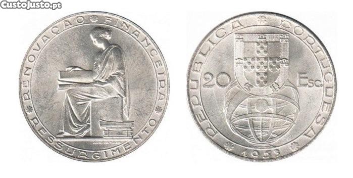 Moedas Portuguesas, 20$ escudos, 'Renovação Financeira', 1953, em prata (Ag 800%), SOBERBA.