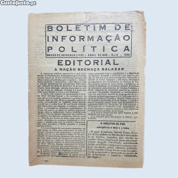 Documento de extrema raridade dado o seu carácter clandestino, distribuído durante o Estado Novo. Exemplar bem estimado e invulgar.