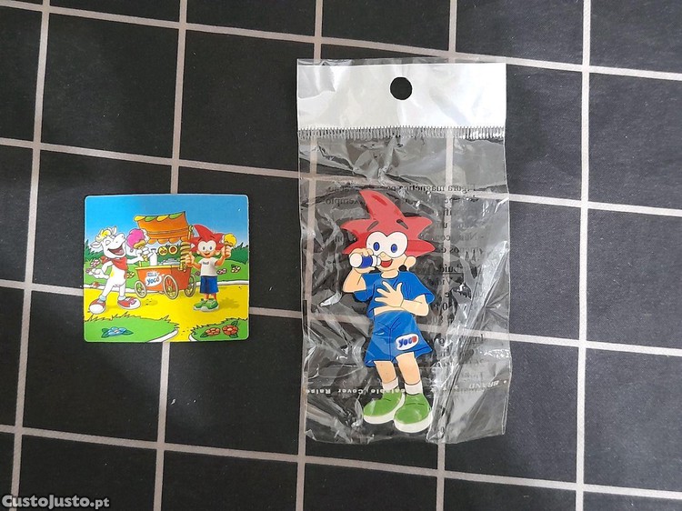 Par de ímanes para frigorífico da famosa personagem Yoco, brinde dos produtos Nestlé dos anos 2000. Artigos para coleccionadores ou amantes da memorabilia. Estão novos, um deles ainda fechado na embalagem original. O Yoco embalado tem 7 cm de comprimento e o outro, de formato quadrado mede 4,5 cm x 4,5 cm. Não vendo em separado, só o conjunto e o preço anuciado diz respeito aos dois.Barato para desocupar. Negociável, vendo pela melhor oferta. Possibilidade de vir buscar em mão.