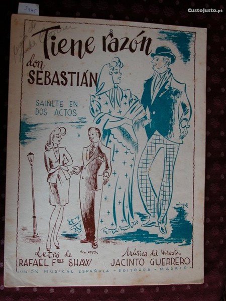 N 5945 - Partitura musical . Tiene razón dom Sebastián. Sainete em dos actos. Música del maestro Jacinto Guerrero. Capa de Mingote.