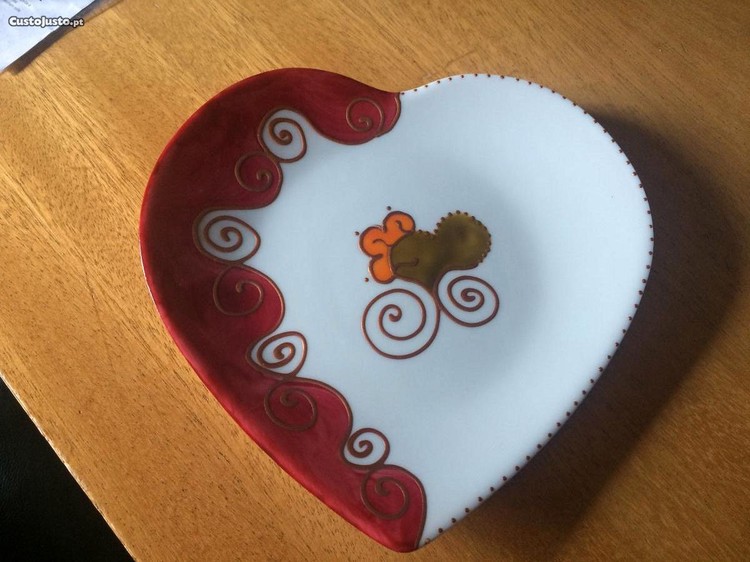O prato de porcelana tem a forma de coração, alusivo aos dia dos namorados.