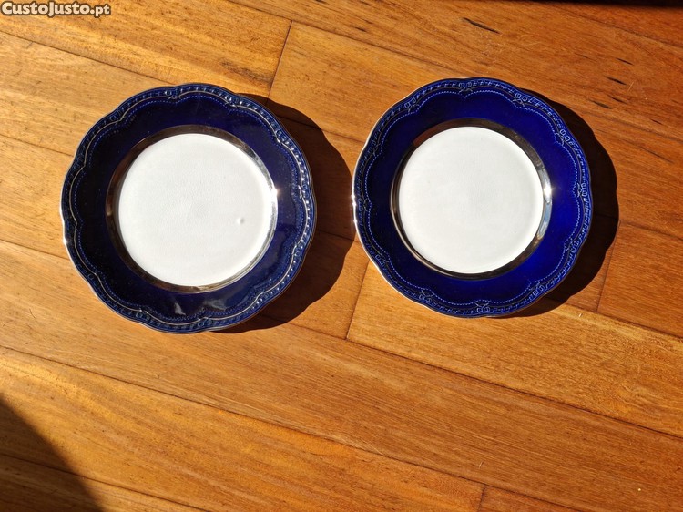 Vendo 2 pratos antigos, usados, fabricados por Gilman & CTª - Sacavém com faixa larga e sólida em azul escuro (cobalto) na aba e um filete fino de ouro a delinear a borda externa, com 24,5 cm de diâmetro.
