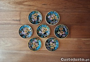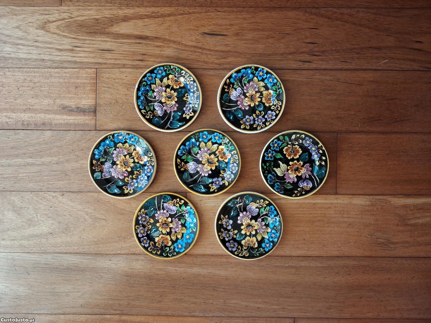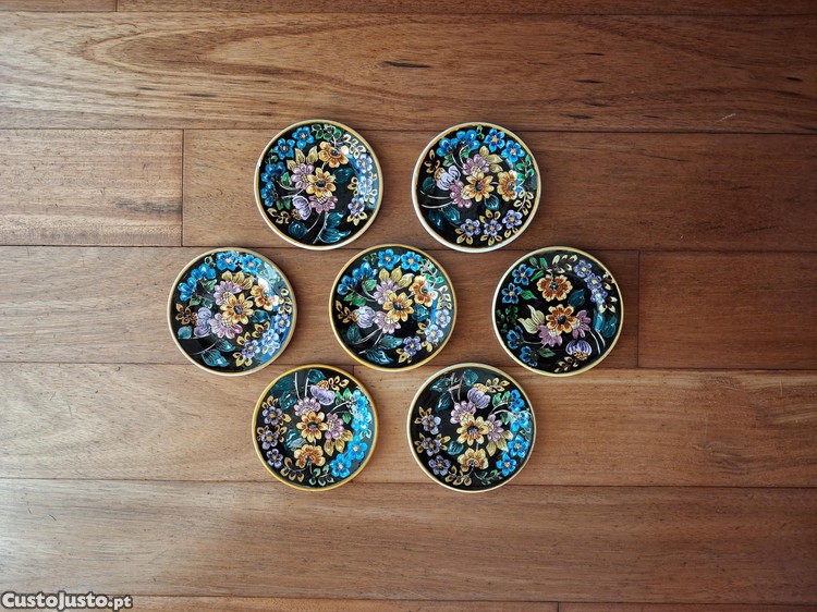 Vendo 7 pratos antigos, sem uso, fabricados por Gilman & CTª - Sacavém, pintados à mão, com motivos florais coloridos sobre fundo preto e rebordo amarelo, um com pequeno esbeiçamento na base, três com pequeno esbeiçamento no rebordo inferior, um com pequeno esbeiçamento no rebordo superior, com 10,7 cm de diâmetro.
