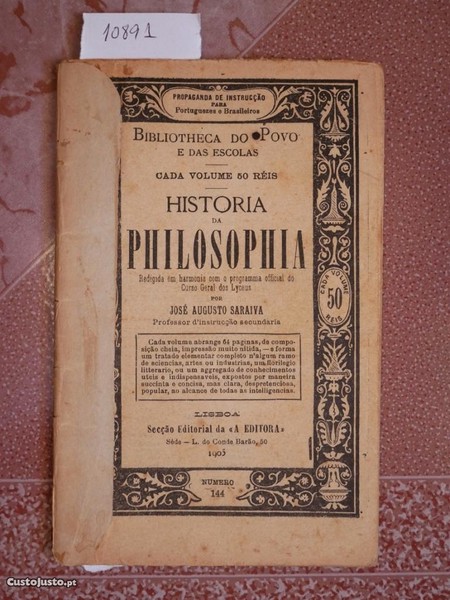 N 10892 - Bibliotheca do Povo e das Escolas. David Corazzi Editor. História da Philosophia por José Augusto Saraiva. N 144, Edição 1905, com 63 páginas. Restauro antigo na lombada e sublinhados no texto.