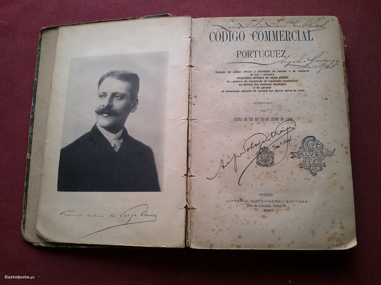 Código Commercial Portuguez (Copiado da Edição Official e Precedido do Retrato e do Relatório do Exc.º Ministro Francisco António da Veiga Barão,do Relatório da Commissão de Legislação Commercial da Câmara dos Senhores Deputados e do Parecer da Commissão Especial da Câmara dos Dignos Pares do Reino)-Approvado Por Carta de Lei de 28 de Junho de 1888-Porto-Livraria Gutenberg,Editor-1888