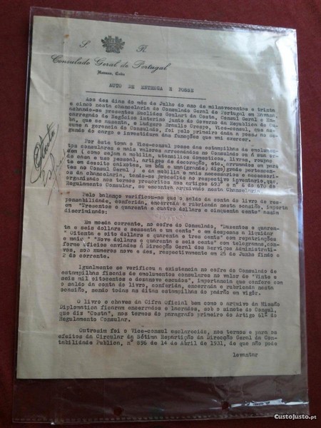 Consulado Geral de Portugal (Habana,Cuba) Documento Original do Auto de Entrega,Posse e Inventário.Assinado e Rubricado por Euclides Goulart da Costa (Consul Geral) e Ludgero Braúlio Crespo (Vice-Consul) Que Lhe Sucede No Cargo.