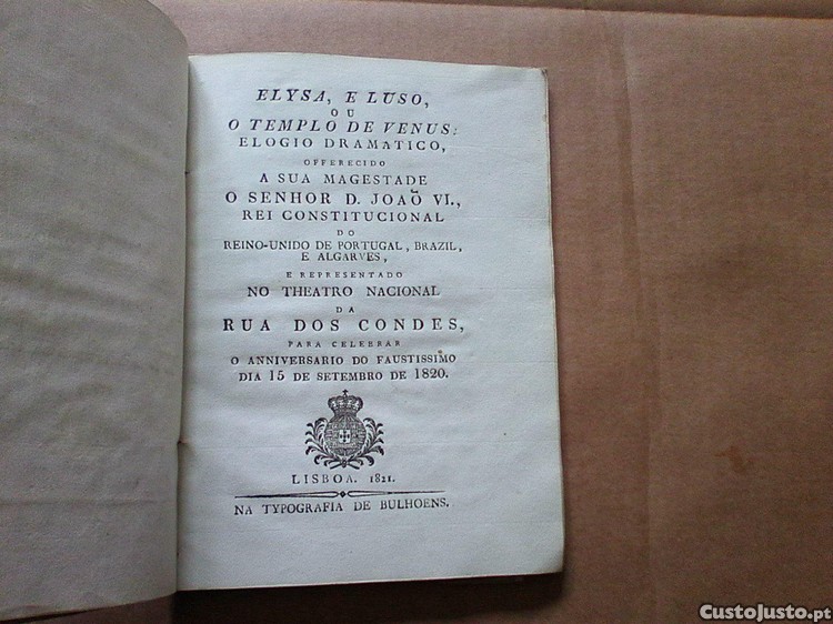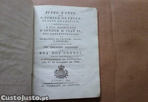Elysa, e Luso , ou O Templo de Venus: elogio dramatico, offerecido a Sua Magestade o Senhor D. Joaõ VI., rei constitucional do Reino-Unido de Portugal, Brazil, e Algarves, e representado no Theatro Nacional da rua Dos Condes, para celebrar o anniversario do faustissimo dia 15 de setembro de 1820.